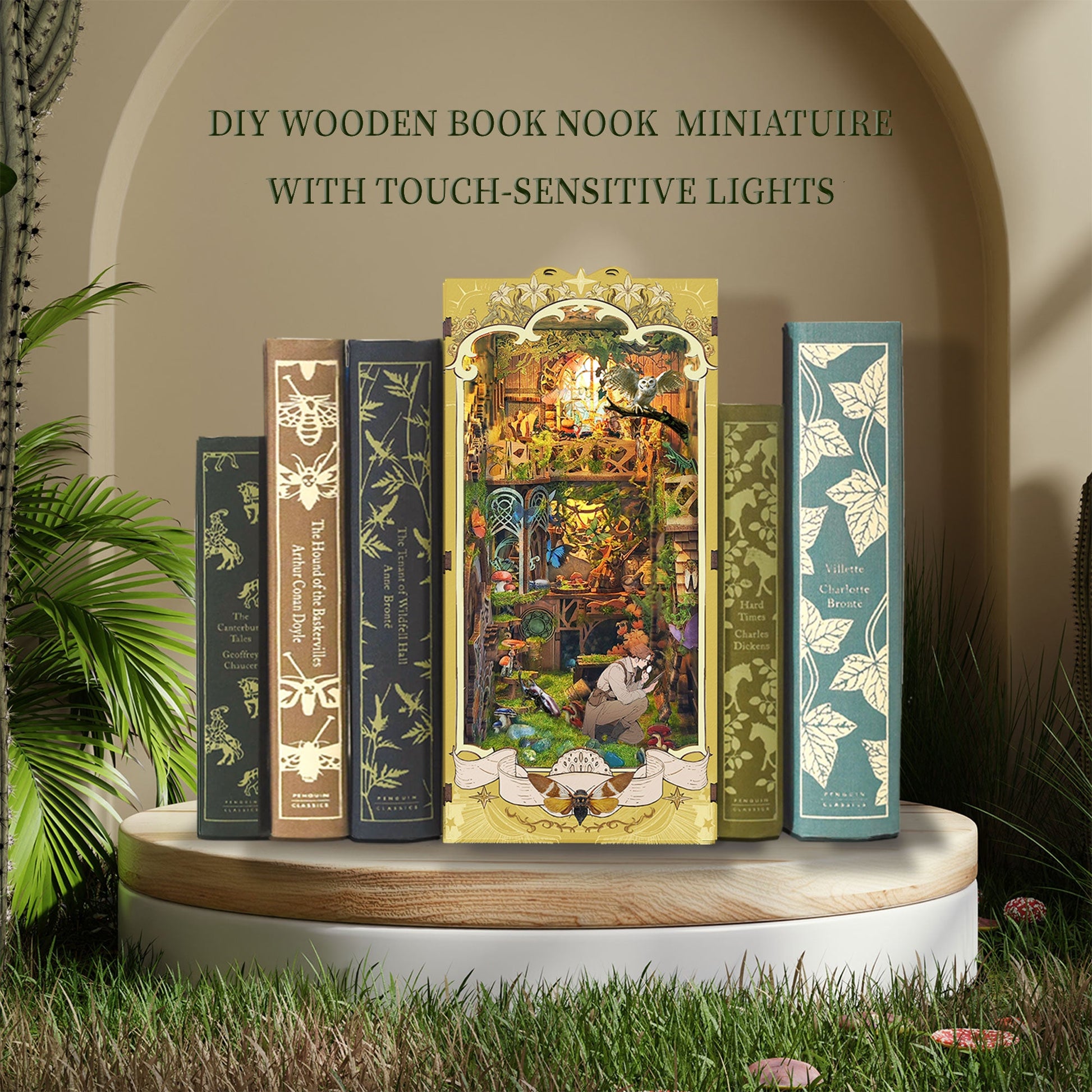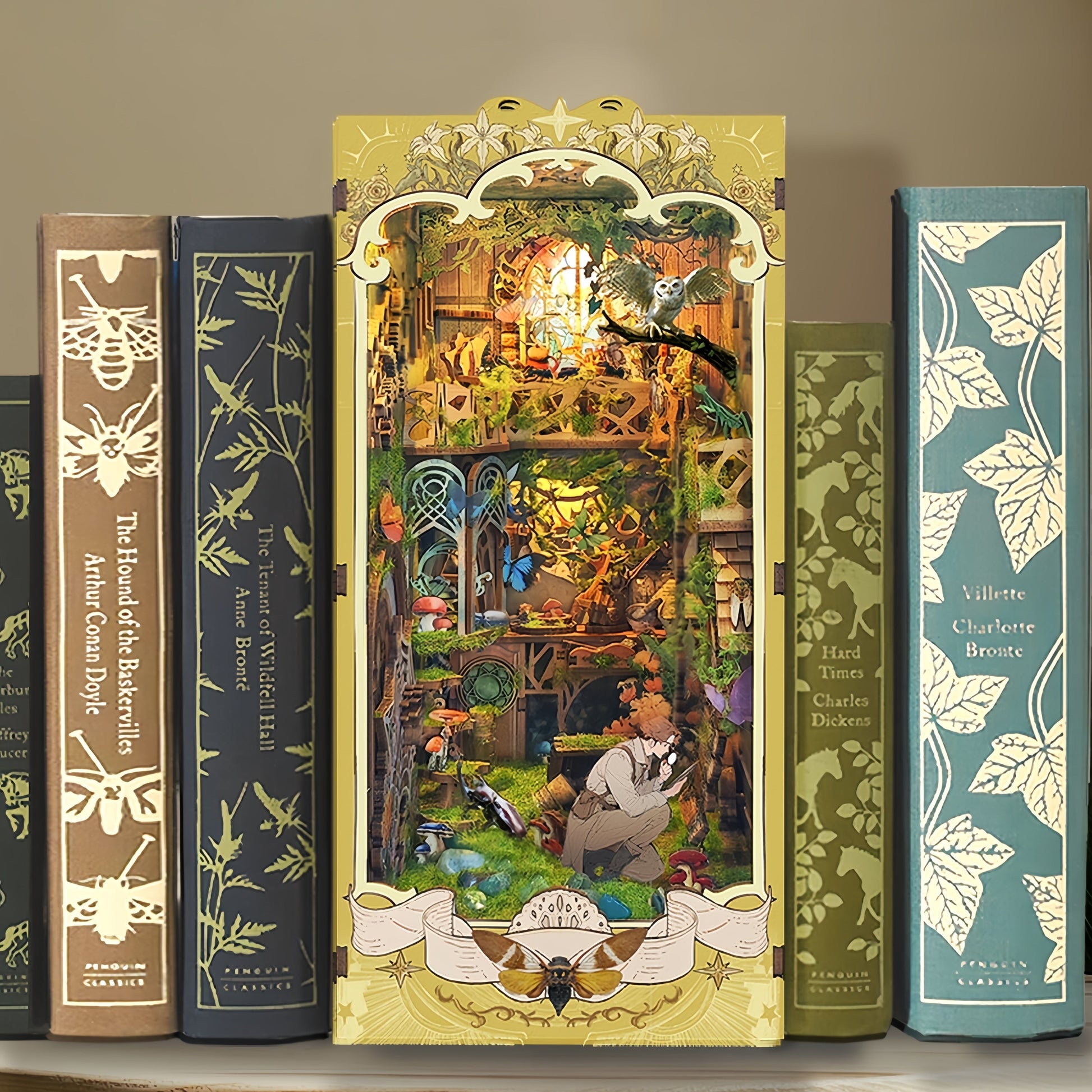 Slides between novels as a glowing, library-themed accent on any shelf.